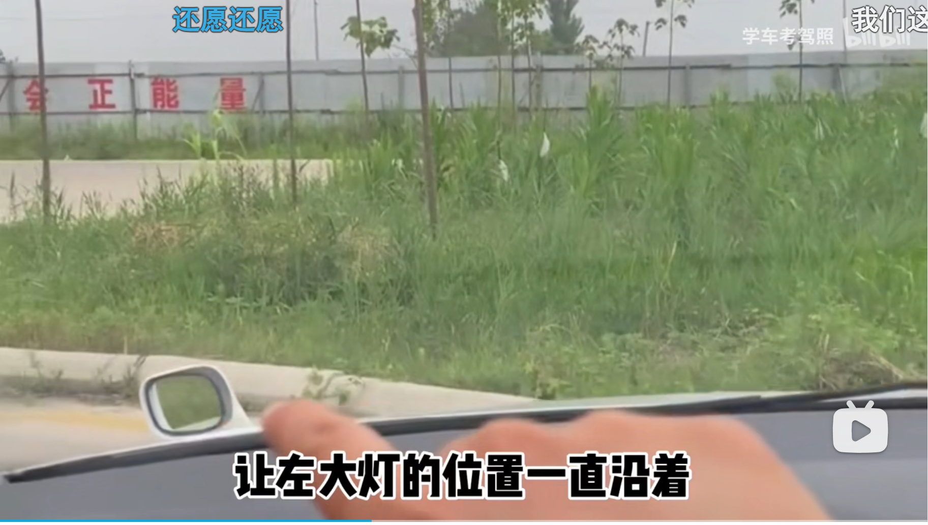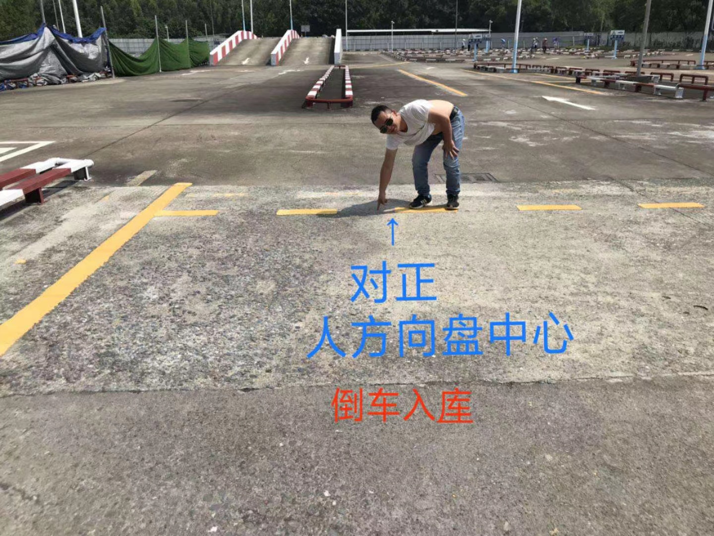 人、方向盘中心与前方点位(练习场是砖头,考场是右起第二条白线中点)连成一线。
