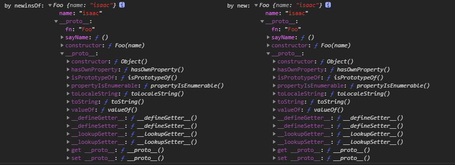 首先,可以看输出结果。很明显两个实例的结构上是基本一致的,类比一下,你可以猜到新语法“class”的实现本质,当然class也确实是传统实现的语法糖。